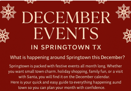 Springtown is filled with festive events all month long. Whether you want local shopping, holiday activities, or family friendly fun, you will find something special on the calendar. Use this guide to plan your December with ease.